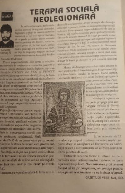 Pentru că se tot vehiculează termenul “neolegionar” prin presa sistemului, din partea Adinei Marincea și altor “cercetători” de la institutul antiromânest Elie Wiesel, m-am gândit că ar fi interesant să ne întoarcem cu 29 de ani în urmă și să citim un articol serios apărut în Gazeta de Vest, cu mult înaintea legii antilegionare și chiar înaintea legii lui Năstase (OUG 31/2002).