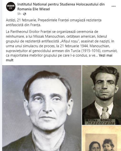 La Pantheonul Eroilor Franței se organizează ceremonia de reînhumare, a lui Missak Manouchian, cetățean american, liderul grupului de rezistență antifascistă „Afișul roșu”, asasinat de naziști, în urma unui simulacru de proces, la 21 februarie 1944. Manouchian, supraviețuitor al genocidului armean din Turcia (1915-1016), comunist, ca majoritatea mebrilor grupului pe care l-a condus, a venit în Europa pentru a lupta împotriva Germaniei naziste. În acea zi au fost executate 23 de persoane care activau în grup. Printre ei s-a aflat și Francis Wolf Bocsor, român de etnie evreiască, originar din Maramureș .