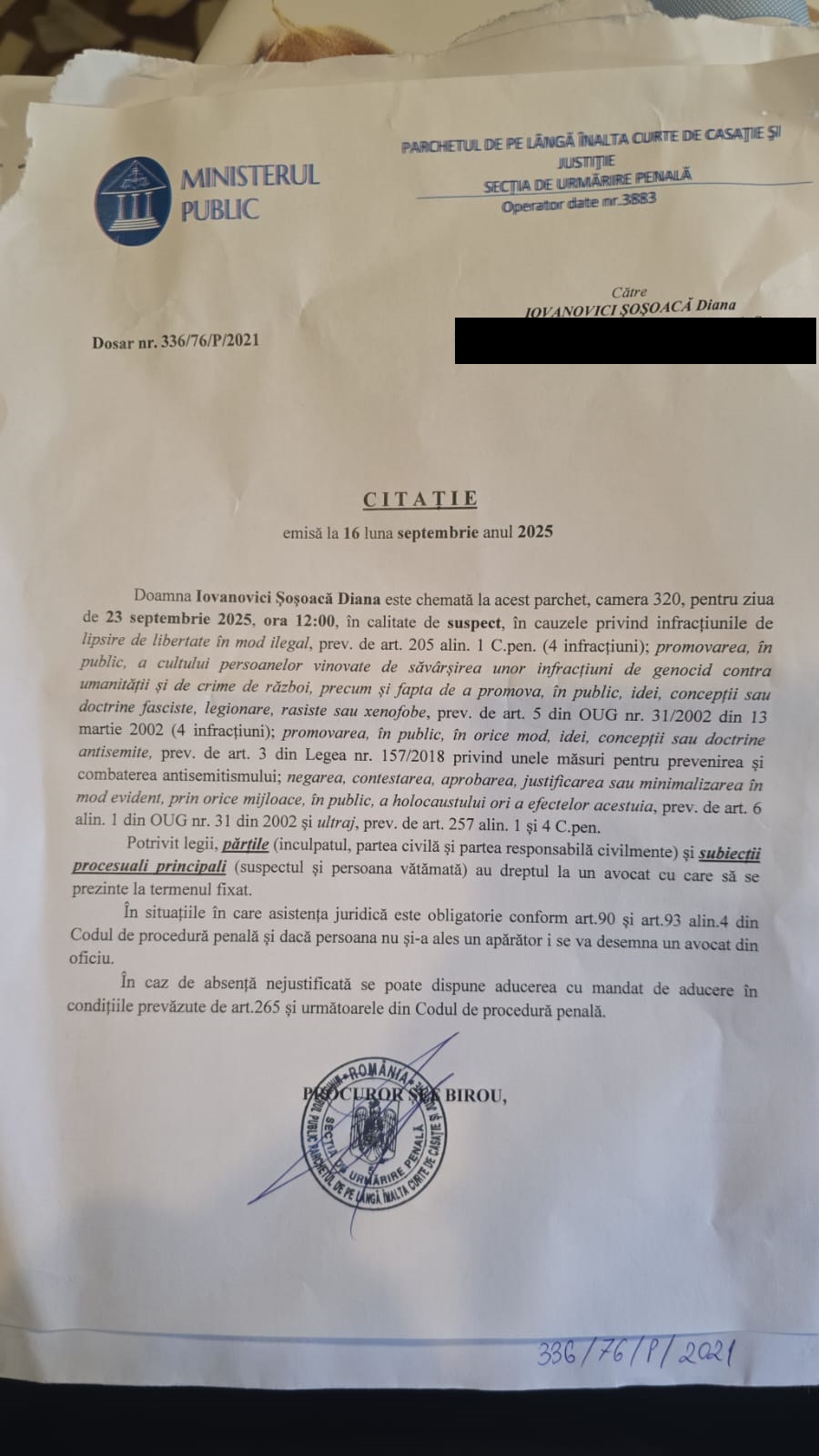 11 infracțiuni într-o citație pentru europarlamentarul Diana Iovanovici-Șoșoacă – acuzații de antisemitism, legionarism și negarea holocaustului