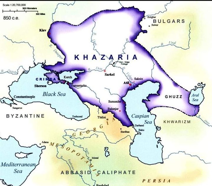 Vechiul regat evreiesc Khazaria se întindea pe teritoriile care sunt azi în partea centrală şi de est a Ucrainei (inclusiv Kievul), în toată Georgia, în Crimeea şi în jumătatea vestică a Kazahstanului (ţară în care „investesc“ de mai mulţi ani evreii din Israel şi din toată lumea, cum au făcut până azi şi în Ucraina).