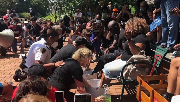 Este drumul spre egalitate totală? Nu e sigur. În timpul manifestațiilor anti-rasism de sâmbătă, 6 iunie, în Carolina de Nord, americanii și polițiștii albi au spălat picioarele compatriotilor de culoare. Scopul era să-și ceară iertare pentru toți „anii de rasism” la care au fost supuși. Conform Daily Mail, albii s-au inspirat din povestea biblică a lui Iisus spălând picioarele discipolilor săi. Au fost membri ai Legacy Church Center, o biserică evanghelică din Carolina de Nord, care au ajutat la organizarea unui marș de rugăciune și unitate.