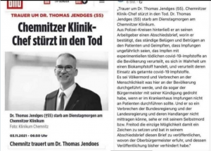 “Minciuna continuă față de pacienți și persoanele vaccinate, precum și înșelăciunea cu privire la pericolele vaccinării. Vaccinarea cu vaccinuri experimentale mortale Covid-19. În realitate este o armă biologică, utilizarea sa fiind camuflată ca vaccin Covid-19. Ceea ce se face populației este un genocid și o crimă împotriva umanității.”, a lasat scris dr. Thomas Jendges. El a mai consemnat ca primarul îl amenințase că îl va concedia dacă refuză să vaccineze pacienții din clinica sa. Managerul mai spune că nu mai putea suporta o asemenea crimă din partea guvernului federal și regional și a complicilor lor și că și-a văzut sinuciderea ca pe o eliberare și o modalitate de a trimite un semnal puternic de pericol. El a cerut ca scrisoarea să fie publicată, lucru de care primarul a luat cunoștință, dar pe care l-a împiedicat initial cu bunastiinta, pana cand politia a aflat de scrisoare, consemneaza cotidianul german Bild, preluat de L’EDI.
