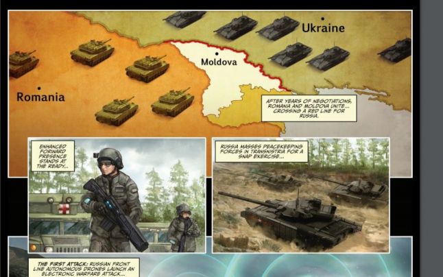 Conform scenariului acestei cărţi de benzi desenate, în 2027 Moldova şi România decid să se unească şi, prin urmare, să încalce „linia roşie“ a Moscovei. Tensiunile degenerează, Rusia şi NATO desfăşoară exerciţii de-a lungul ambelor frontiere. La un moment dat, unele unităţi se abat de la planul de acţiune, roboţii militari se angajează în luptă. Este declanşat un conflict la scară mare.