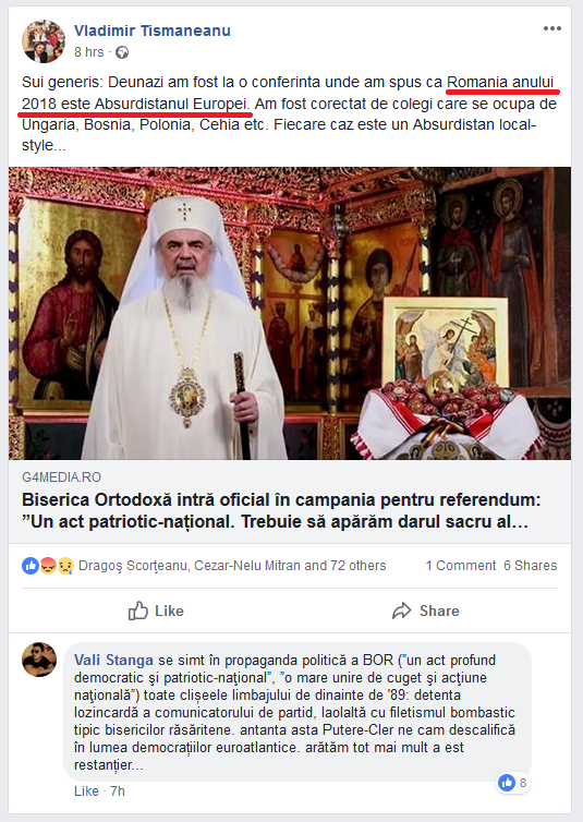 Într-o serie de dejecții anti-Referendum de pe Facebook, la o fotografie ce îl înfățișează pe Patriarhul Bisericii Ortodoxe Române, PF Daniel, ca susținător al Referendumului, Tismăneanu adaugă următorul comentariu “doct”: “Sui generis: Deunazi am fost la o conferinta unde am spus ca Romania anului 2018 este Absurdistanul Europei”, în timp ce despre un cititor care i-a scris indignat despre această atitudine scrie că este “un sustinator al CpF, “intelectual” din Iasi. Sincer, n-am nici timp, nici chef sa am de-a face cu acesti neanderthalieni”.