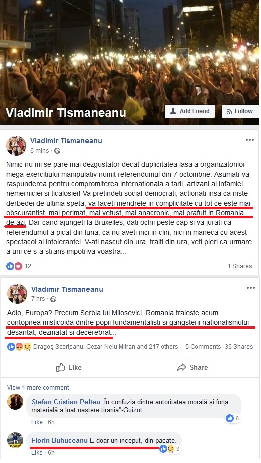 Un alt comentariu cu iz marxist-leninist ne dezvăluie efectul broșurelelor comuniste din copilăria sovietică a analistului Tismăneanu: “Adio, Europa? Precum Serbia lui Milosevici, Romania traieste acum contopirea misticoida dintre popii fundamentalisti si gangsterii nationalismului desantat, dezmatat si decerebrat… ” Șeful homosexualilor din România, Florin Buhuceanu, comentează imediat: “E doar un inceput, din pacate.”