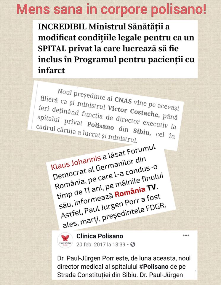9. Pe 18 noiembrie 2019ministrul Victor Costache modifică un Ordin de ministru din 2015. El adaugă „Clinica Polisano Sibiu” pe lista spitalelor care beneficiază de un program finanțat de stat. De asemenea, ministrul Victor Costache, angajat POLISANO, modifică și criteriile de eligibilitate înlocuind „două angiografe” cu „un angiografPOLISANO Sibiu deține UN angiograf...