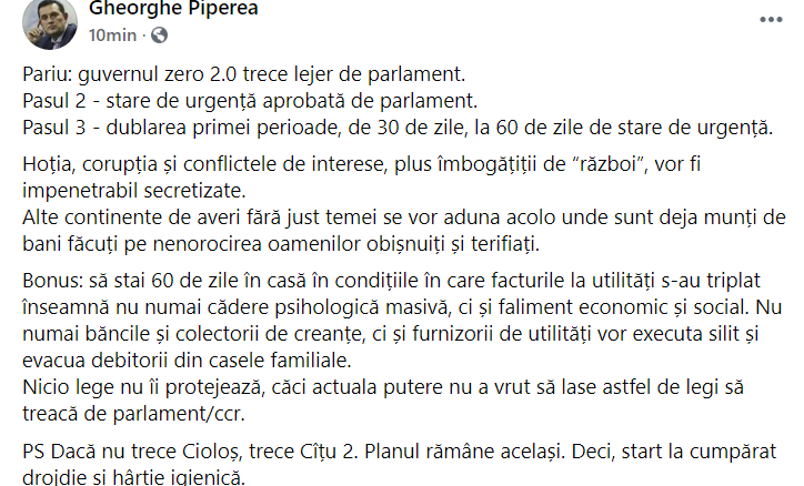 Bonus: să stai 60 de zile în casă în condițiile în care facturile la utilități s-au triplat înseamnă nu numai cădere psihologică masivă, ci și faliment economic și social. Nu numai băncile și colectorii de creanțe, ci și furnizorii de utilități vor executa silit și evacua debitorii din casele familiale.