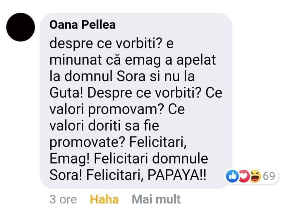 În final Oana Pellea felicită Papaya pentru ca Papaya la rândul lor l-au apărat pe bolșevicul Mihai Șora.