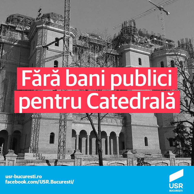 USR consideră că acest obiectiv – Catedrala Mântuirii Neamului – trebuie finanțat de acum înainte exclusiv din donații private și din fondurile proprii ale Bisericii. Sprijinul acordat de stat către culte, atât de la nivel guvernamental cât și de la nivel local, este deja suficient și nu trebuie suplimentat cu sume de ordinul zecilor de milioane de euro anual pentru această catedrală.