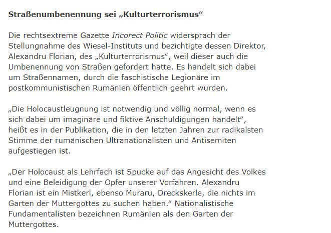 “Holocaustul ca materie școlară este un scuipat în fața poporului și o insultă la adresa victimelor strămoșilor noștri. Alexandru Florian este un nenorocit, la fel și Muraru, niște scursuri care nu au ce căuta în grădina Maicii Domnului.” Fundamentaliștii naționaliști se referă la România ca la grădina Maicii Domnului.