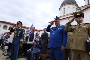 După ce s-a terminat slujba, la ora 12, cînd în toată țara au început să fie trase clopotele, activitatățile s-au mutat în fața mauzoleului din incinta mănăstirii (din cite am înțeles, unul dintre cele 8 mauzolee ale eroilor existente în România). În fața unui banner mare fixat pe perete, între drapelele României, avînd în lateral garda de onoare de la școala SRI din Grădiștea, a fost adusă masa (timp în care praporii, ținuți de bărbați în costum național erau în apropiere). A vorbit întîi dl. gen. Radu Theodoru, apoi, după „Deșteaptă-te române”, părintele arh. Mihail. După care s-a cîntat „Imnul Eroilor”.
