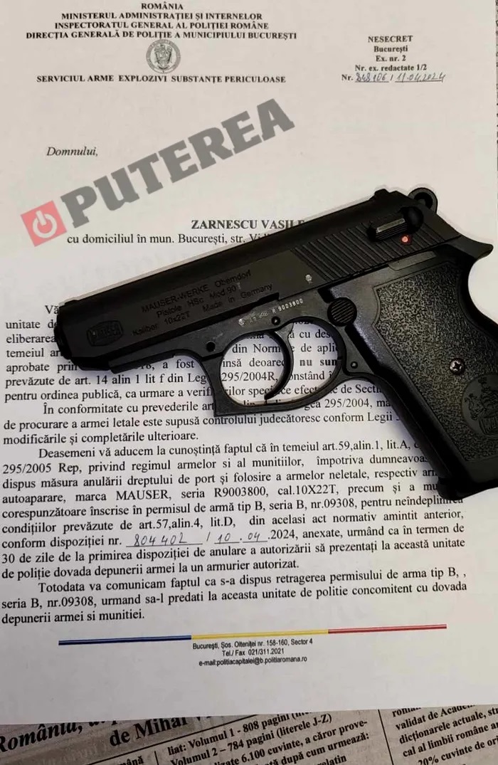Dar, în imaginea capturată, în documentul nr. 848106/11.04.2024, emis de „Serviciul Arme…“, scrie clar: „…împotriva dvs. s-a dispus măsura anulării dreptului de port armă și folosire a armelor neletale, respectiv a armei de autoapărare, marca MAUSER, seria R9003…“ (s.n. – V.I.Z.). Deci, pistolul pe care mi-l procurasem, marca MAUSER, seria R9003…, cu aprobarea „Serviciului arme, explozibili,…“, este armă neletală, de autoapărare, cu cartușe cu gloanțe de cauciuc! Dar ticăloșii din conducerea M.A.I. au complotat să mi-l retragă și pe acesta, ca să fiu dezarmat în cazul unei agresiuni foarte posibile contra mea. În situația atacării mele de vreun borfaș cu pielea groasă, gloanțele de cauciuc ar avea efectul unei frecții la un picior de lemn! Voi reveni asupra chestiunii, dar acum să vorbim de dezinformarea măgărească comisă de Orjan.